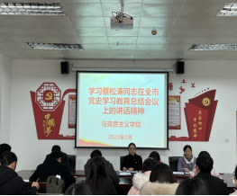 会上,祁欢院长首先传达贯彻省委书记楼阳生在信阳调研时的讲话指示精神,动员马院全体党员教师进一步坚定信心、鼓足干劲,埋头苦干、奋勇争先,践行“两个更好”、锚定“两个确保”,奋力开创“美好生活看信阳”新局面。然后领学《蔡松涛同志在全市党史学习教育总结会议上的讲话》精神,并对马院党史学习教育工作开展情况进行了总结,对进一步巩固拓展党史学习教育成果作了安排部署。