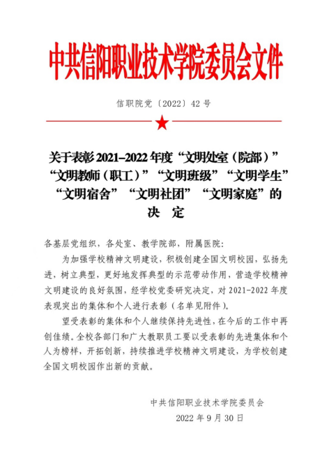 《关于表彰2021-2022年度“文明处室(院部)”“文明教师(职工)”“文明班级”“文明学生”“文明宿舍”“文明社团”“文明家庭”的决定》,对2021-2022年度表现突出的集体和个人进行表彰